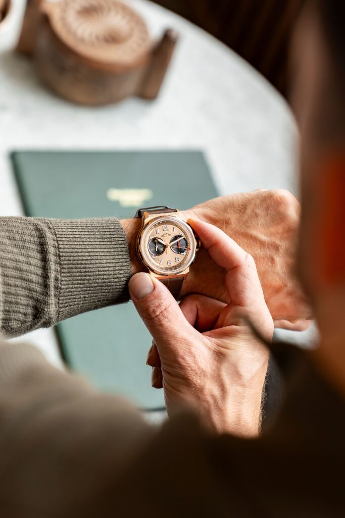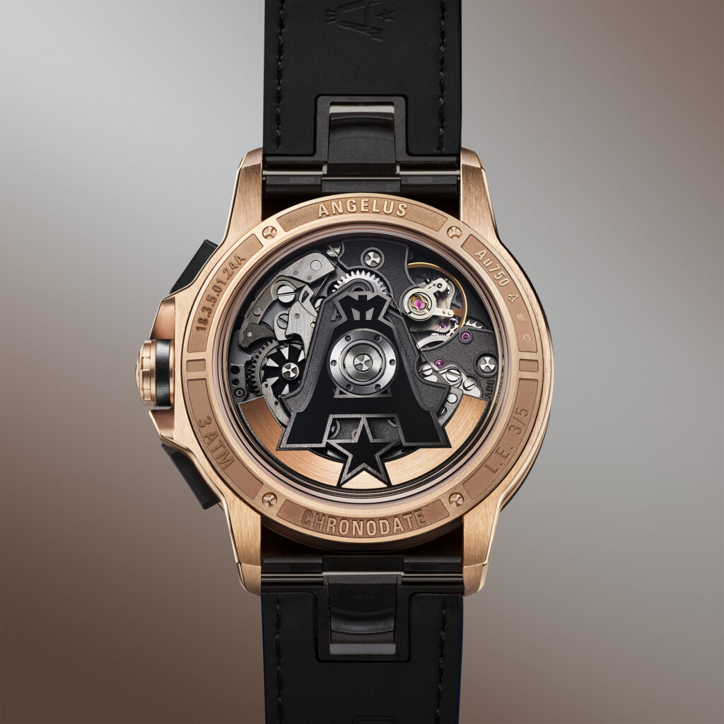 Les grands sous-compteurs reprennent l’ADN des chronographes Angelus des années 1930, conçus pour une lisibilité optimale. Cette approche néo-rétro, combinée aux finitions modernes, renforce la personnalité unique de la pièce.